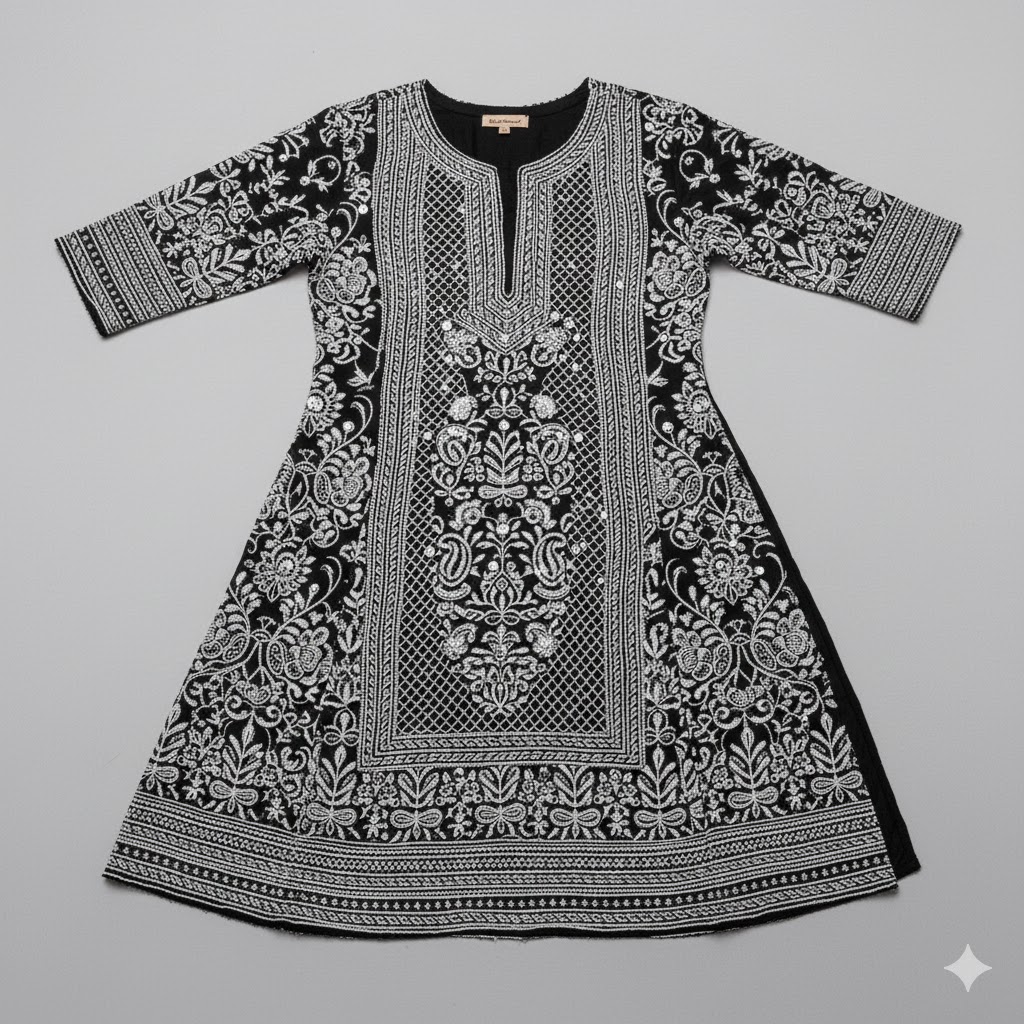 Elegant black kurti with intricate embroidery, perfect for casual and festive occasions.