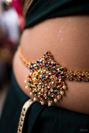 A stylish and elegant waist chain designed to accentuate your ethnic and festive outfits. Perfect for weddings, Navratri, and traditional celebrations.