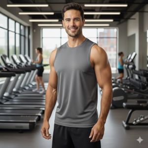 A grey sleeveless gym T-shirt made from lightweight, breathable, and moisture-wicking fabric — perfect for workouts, training, and an active lifestyle.