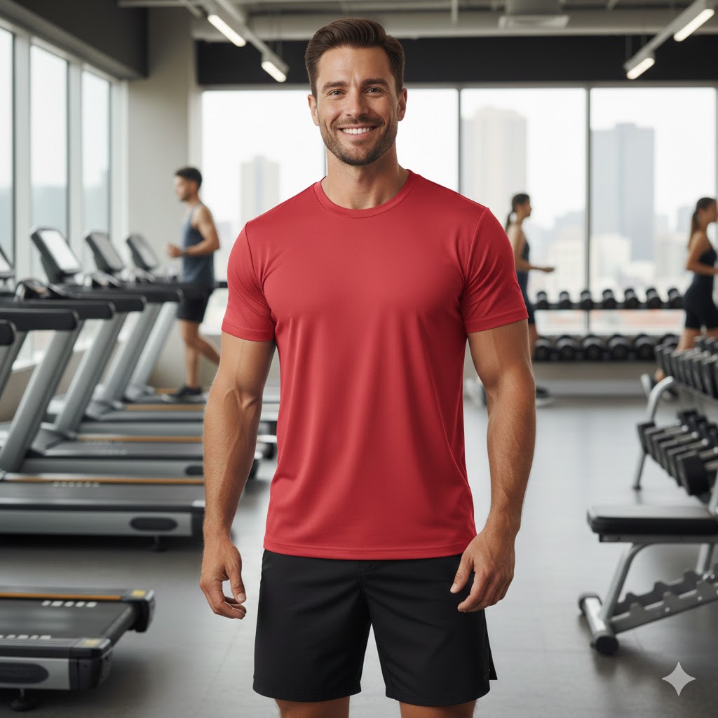 A red gym T-shirt made from lightweight, breathable, and moisture-wicking fabric with a classic round neck and short sleeves — ideal for workouts, training, and active lifestyles.
