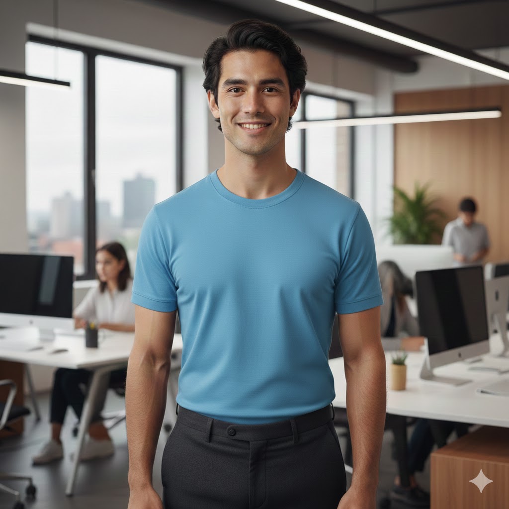 A casual sky blue campus T-shirt made from soft, breathable cotton with a round neck and short sleeves — perfect for everyday wear and campus style.