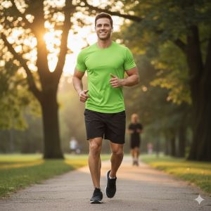 A green running T-shirt made from lightweight, breathable, and moisture-wicking fabric with a classic round neck and short sleeves — perfect for running, workouts, and active lifestyles.