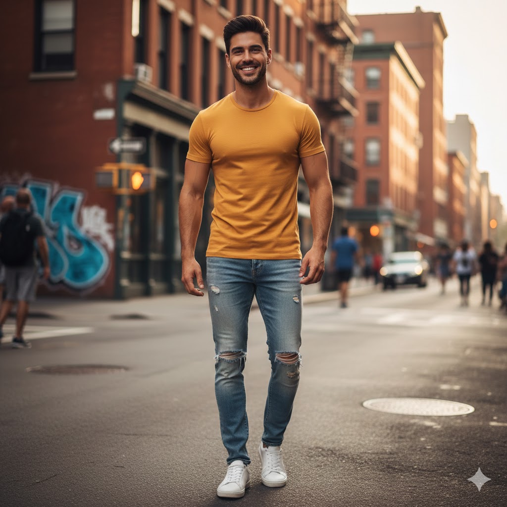 A vibrant yellow mustard T-shirt made from soft, breathable cotton with a classic round neck and short sleeves — ideal for casual, everyday wear.