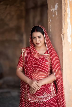 Celebrate the spirit of Gujarat with this stunning red Gujarati chaniya choli, featuring intricate traditional embroidery and mirror work. The ensemble includes a beautifully tailored choli paired with a flared chaniya skirt, creating a festive and elegant look.
