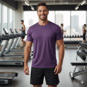 A purple fitness T-shirt made from lightweight, breathable, and moisture-wicking fabric with a classic round neck and short sleeves — ideal for workouts and active lifestyles.