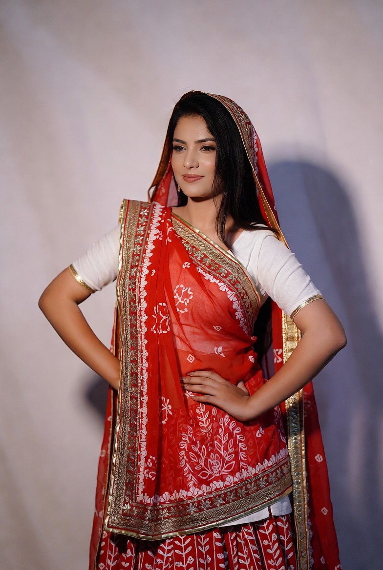 Celebrate tradition with this stunning red Gujarati saree, adorned with intricate embroidery and mirror work that reflects the rich heritage of Gujarat. Made from high-quality, breathable fabric, it drapes gracefully for a flattering and elegant look.