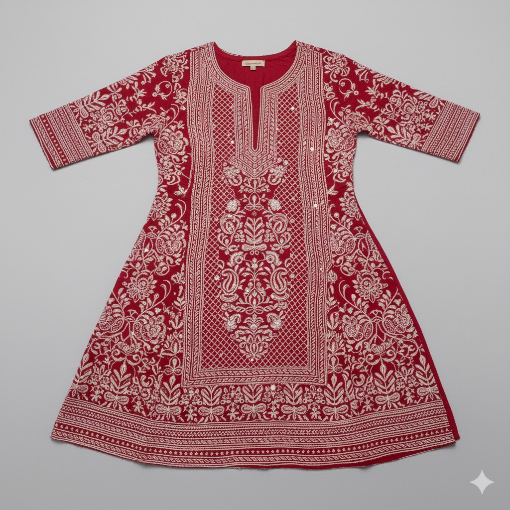 Elegant red kurti with intricate embroidery, perfect for casual and festive occasions.