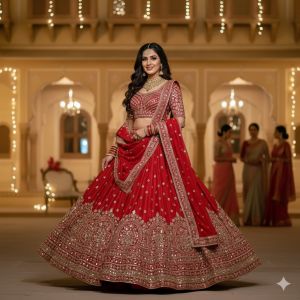 Stunning royal red chaniya choli with intricate embroidery, perfect for festive and traditional occasions.