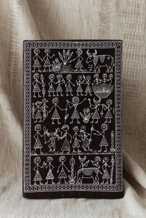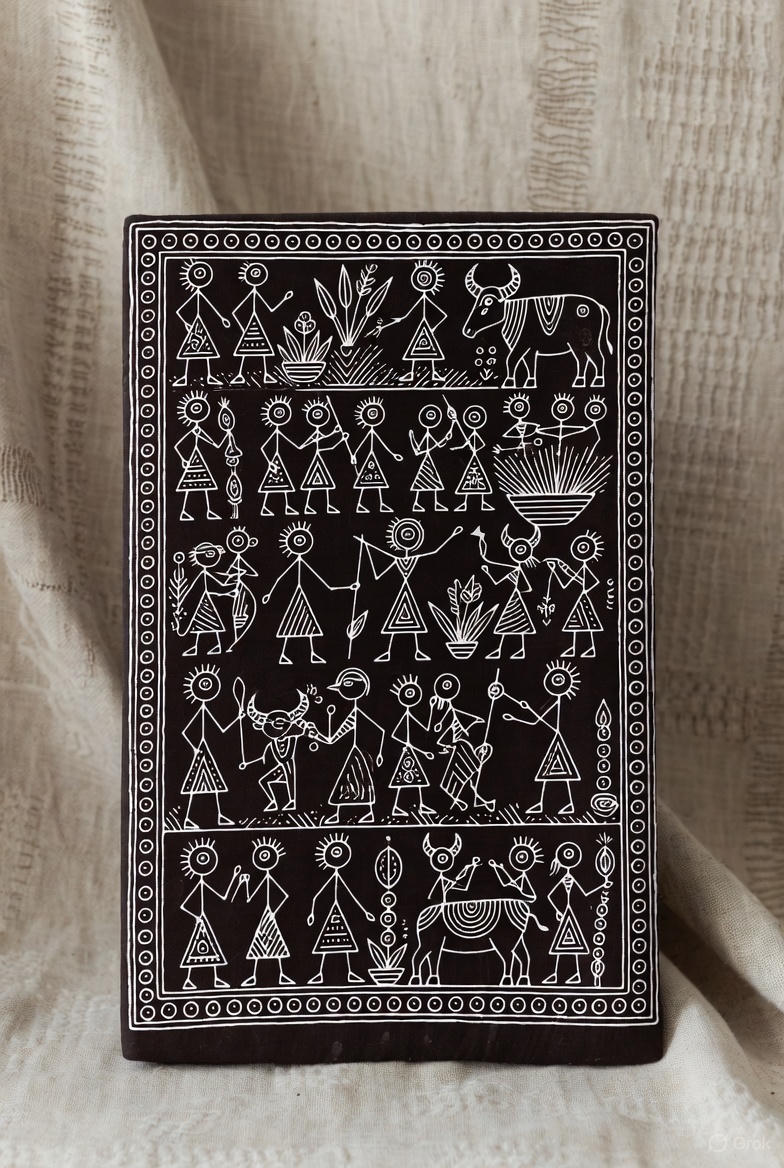 Authentic Warli painting, handcrafted by tribal artists, featuring traditional white tribal motifs on earthy backgrounds.