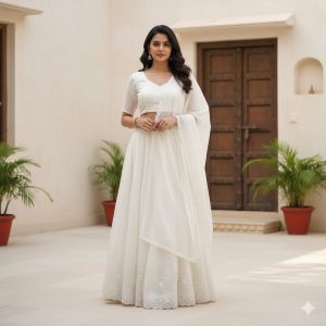 Step into timeless elegance with this beautiful white chaniya choli, crafted for those who love classic, graceful ethnic wear. The lehenga features a rich white tone that enhances its royal appeal, while the matching choli complements the look with a clean, sophisticated finish. The overall design highlights purity, simplicity, and cultural charm.